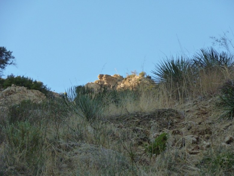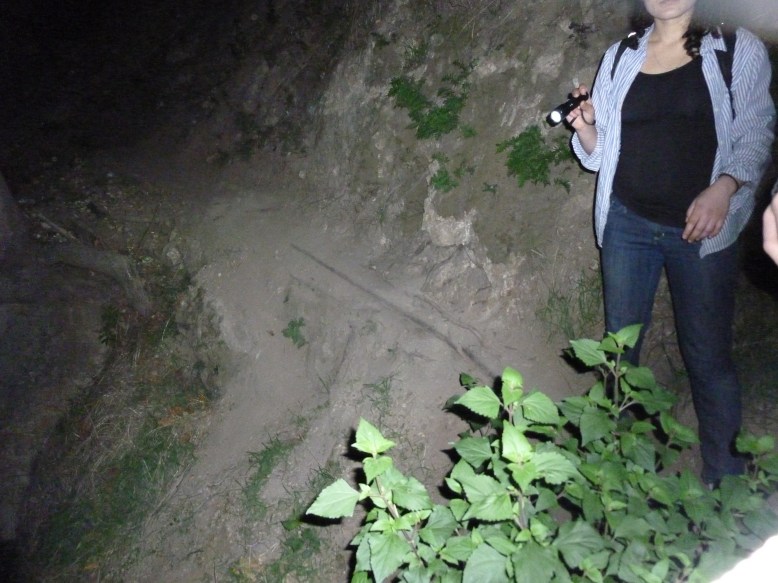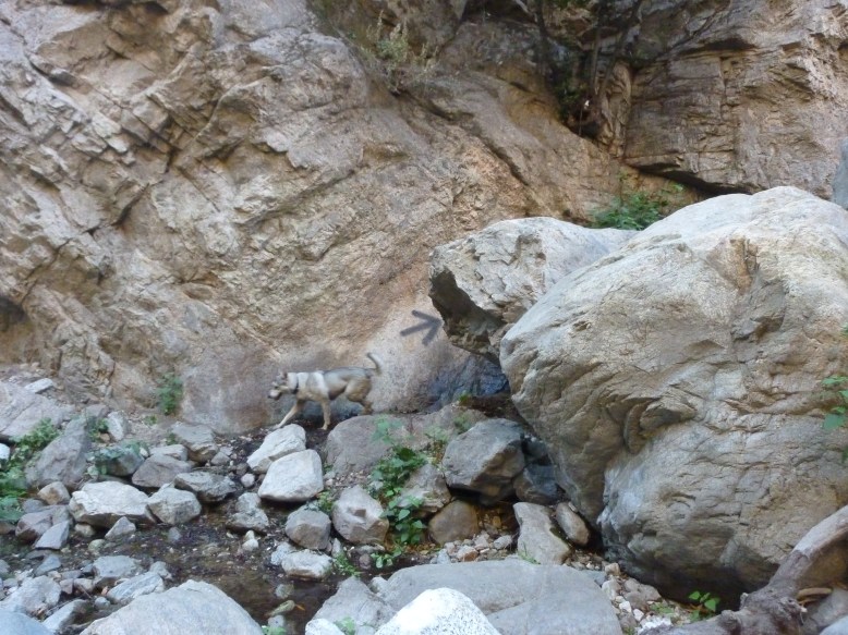 After many stream crossings, sort climbs down boulders, and a few instances of tripping and almost falling, we arrived back at the fork. Here we proceeded to climb about 6 feet back up to the riverbank, and headed back to where we had come from. Upon finding the marked tree and the steep slope next to the cabin, we ascended out of the canyon floor and back onto the trail. Feeling that we were almost done, we increased our pace, especially when we noticed a pair of glowing eyes on the cliff above us.