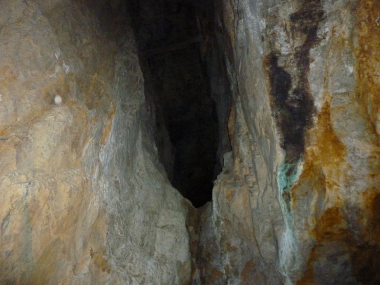 After reaching the main area again, we set out to explore the other passage. To do this, we had to navigate a thin ledge on the edge of a huge pool of water, reputed to be 55-80 feet deep. Scary, and very full of very cold water. I hypothesize that it was originally another mineshaft, but later they ran into water and it flooded. Someday, somebody should build an ROV and see what there is to see down there! Hmm. Somebody interested in mines, who is an engineer would be perfect for this project!