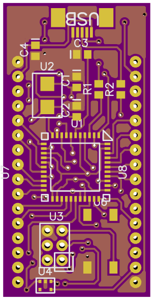 - Atmega32u4 with all non power or ground pins broken out to header pins on edges of board