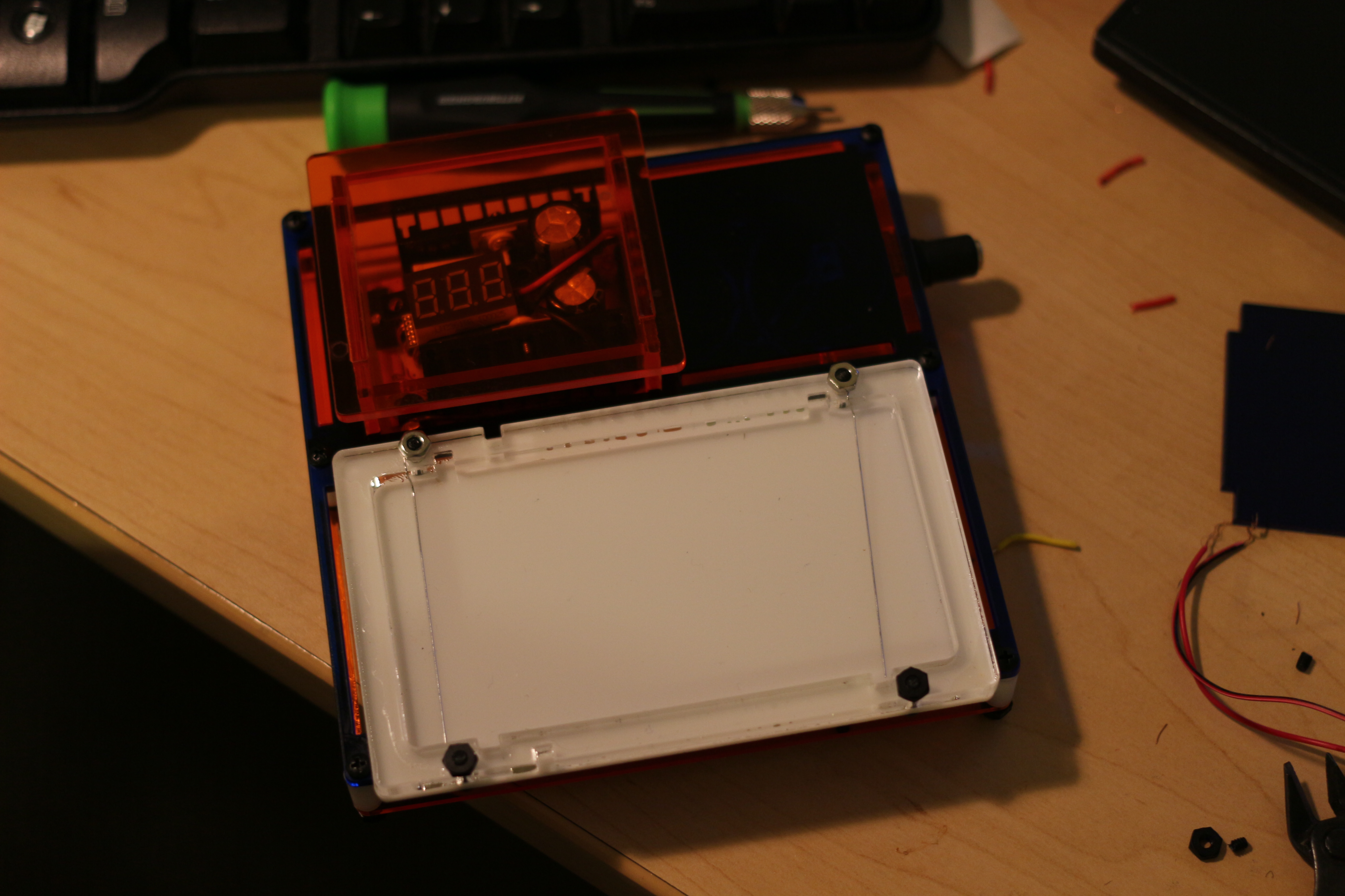 Almost ready to test the latest prototype!  Everything electrical is go, but I managed to loose my LED panel in my moves from showing my prototype in CA, visiting the bay area, and them moving from an apartment in Somerville back to school.  Oops.
