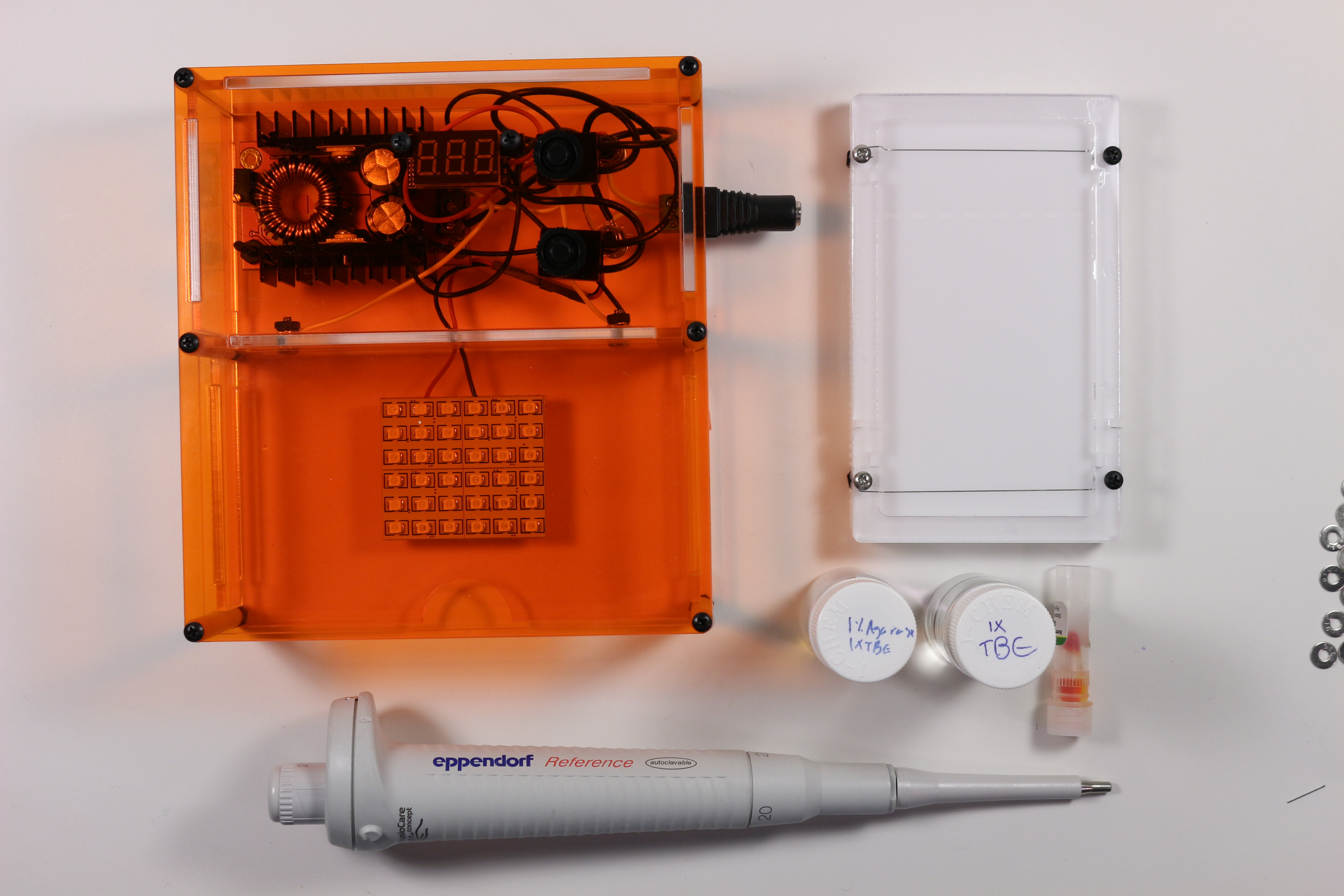 The Gel Integrated System is done. I have packed an electrophoresis power supply, illumination, and casting system into one tiny box. All the parts, other than the enclosure, are off the shelf parts. It can be shipped flat and assembled with only a screwdriver. This all comes in at a sale price that is an order of magnitude lower than commercial systems, with a bench footprint an order of magnitude lower than commercial systems.