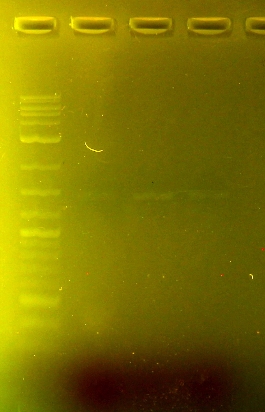 I ran my first attempt at this protocol with a shorter 1 minute extension. This was bad- the region of interest here is ~1.5kb, so at 1kb/min for your typical Taq polymerase, we would require at least 1.5 minutes. I doubled that since I had plenty of time. As you can see in this gel, the shorter extension time meant that I got some pretty small fragments, of varying sizes. They migrated near the dye, which is at about 300bp.