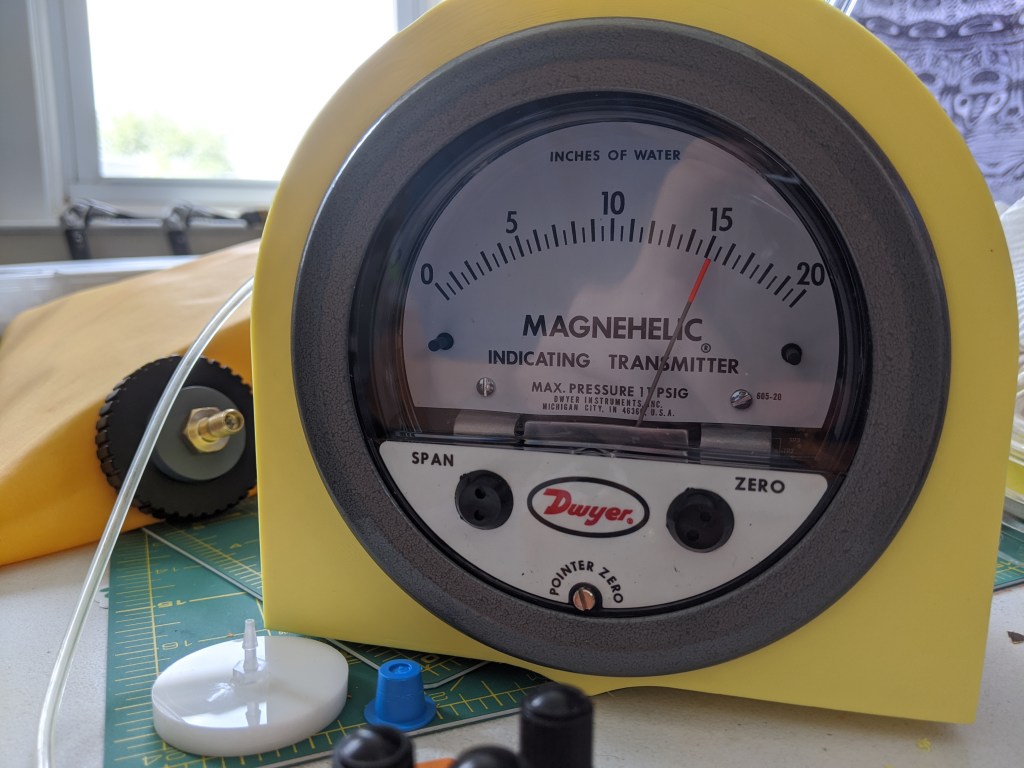 Here is the pressure gauge I’m using. Its a transmitting gauge, which means at some point I’ll hook it up to some kind of data acquisition device to get some time series data, but for the moment I am just reading off the gauge face. It is also extremely sensitive- each division is .018 PSI or ~125 pascals.