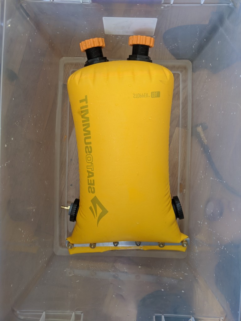 To give an idea of the sensitivity of the gauge, I was pleased and surprised that it can indicate a change in pressure when the sealing bar on the bottom loads the walls of the bag (by lifting the bar with my hand, it takes the weight off the fabric structure). This is important because hopefully the leak is very small and very slow.