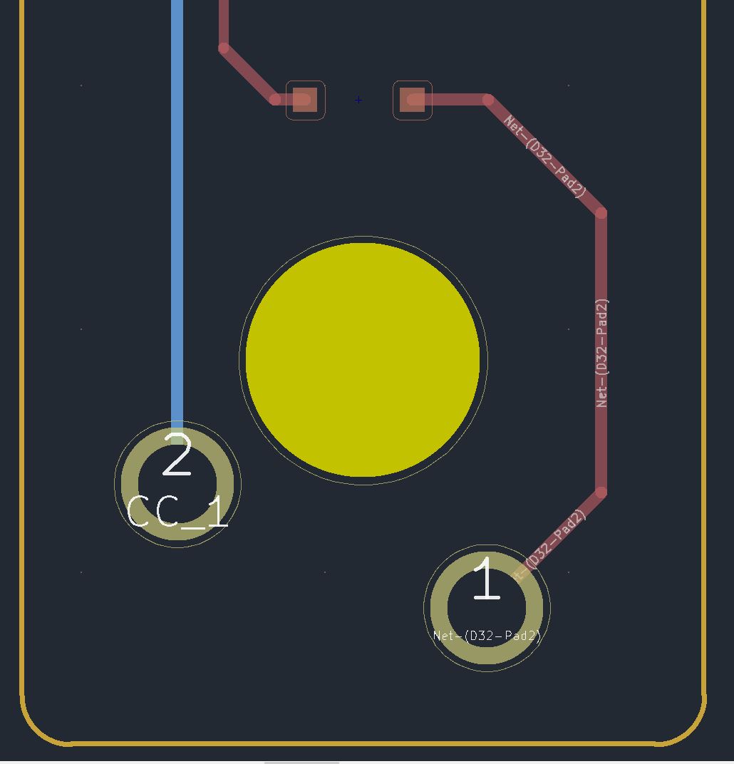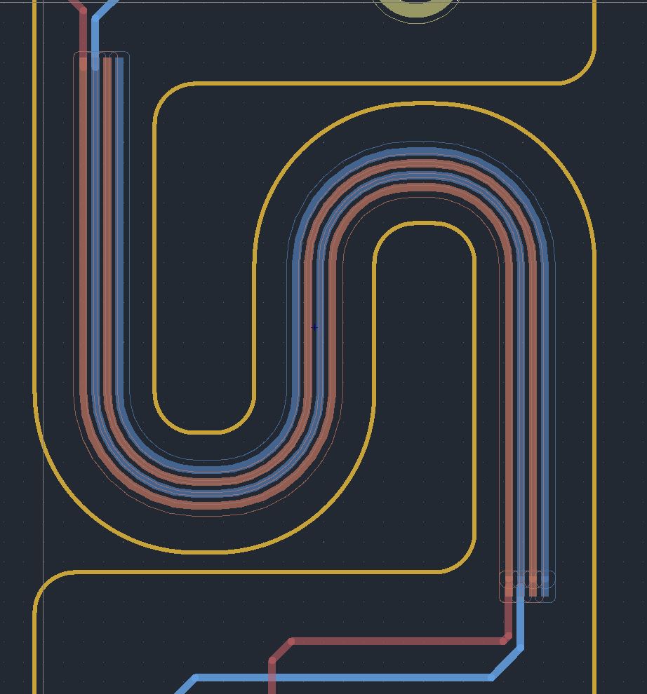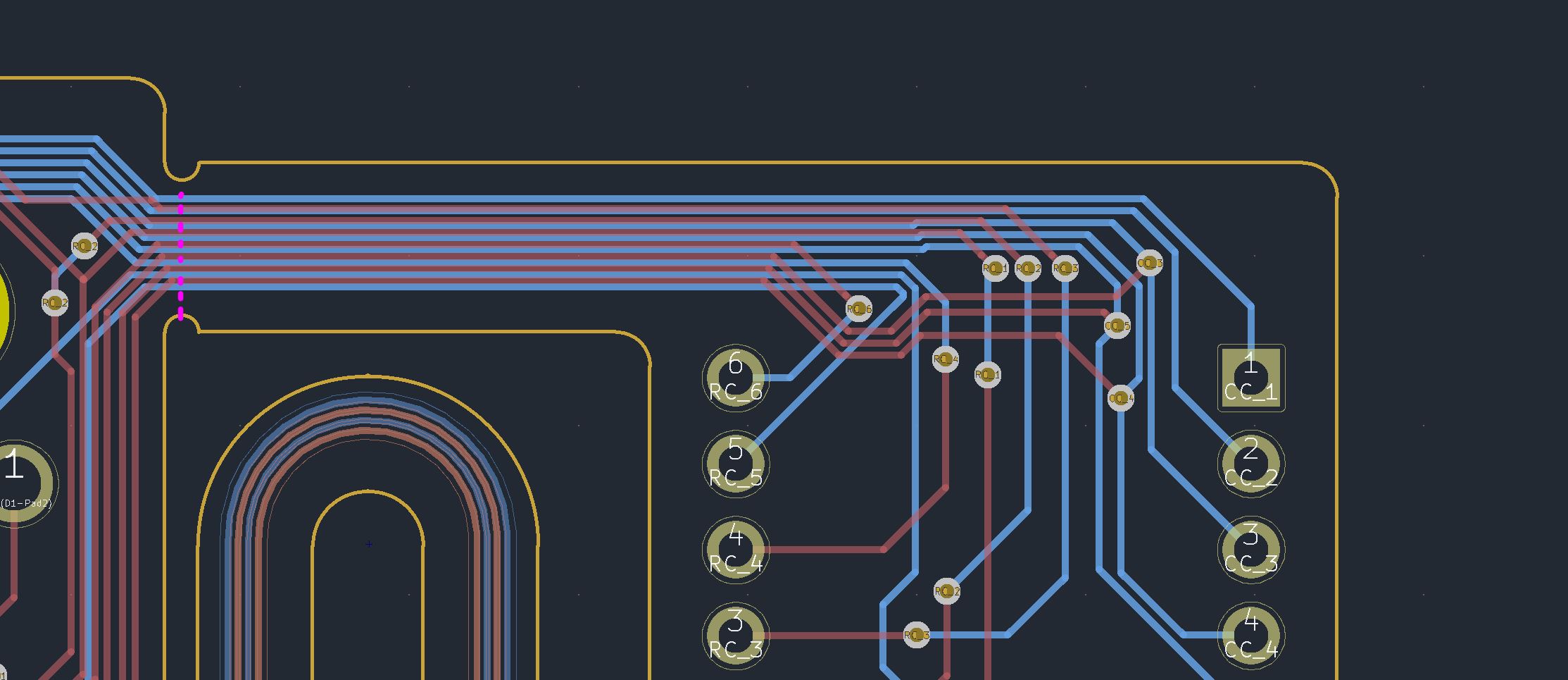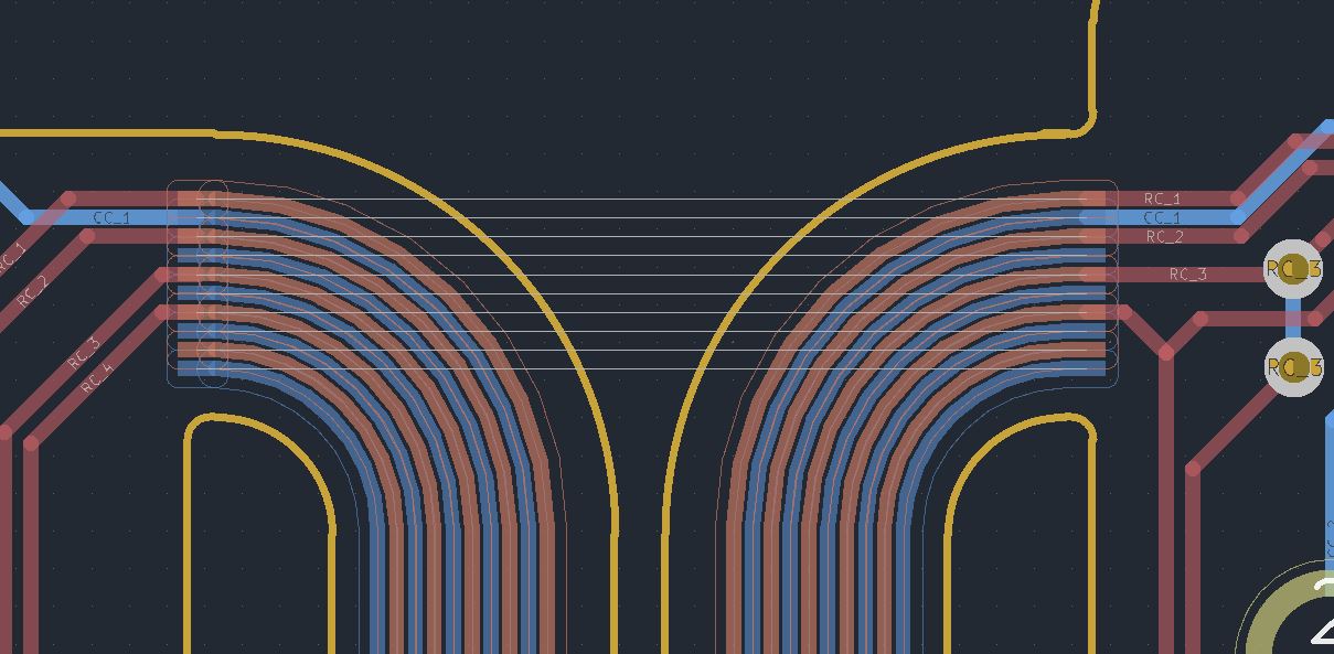 The inter-column connector design was refined over time, and it let me make sure I had the right number of interconnects between columns. Due to constraints in kicad in routing arcs, the actual flex had to be laid out and then converted to a pad footprint in the footprint editor. this means the flex tracks are represented as parts on the schematic, which is a little annoying because it makes the nets not work for DRC errors/net connections, as each pad can only have one anchor. It also made it a little irritating to change routing, because the actual footprint/schematic needed to be changed to make a routing change. On the other hand, I was guaranteed identical routing between all my interconnects.