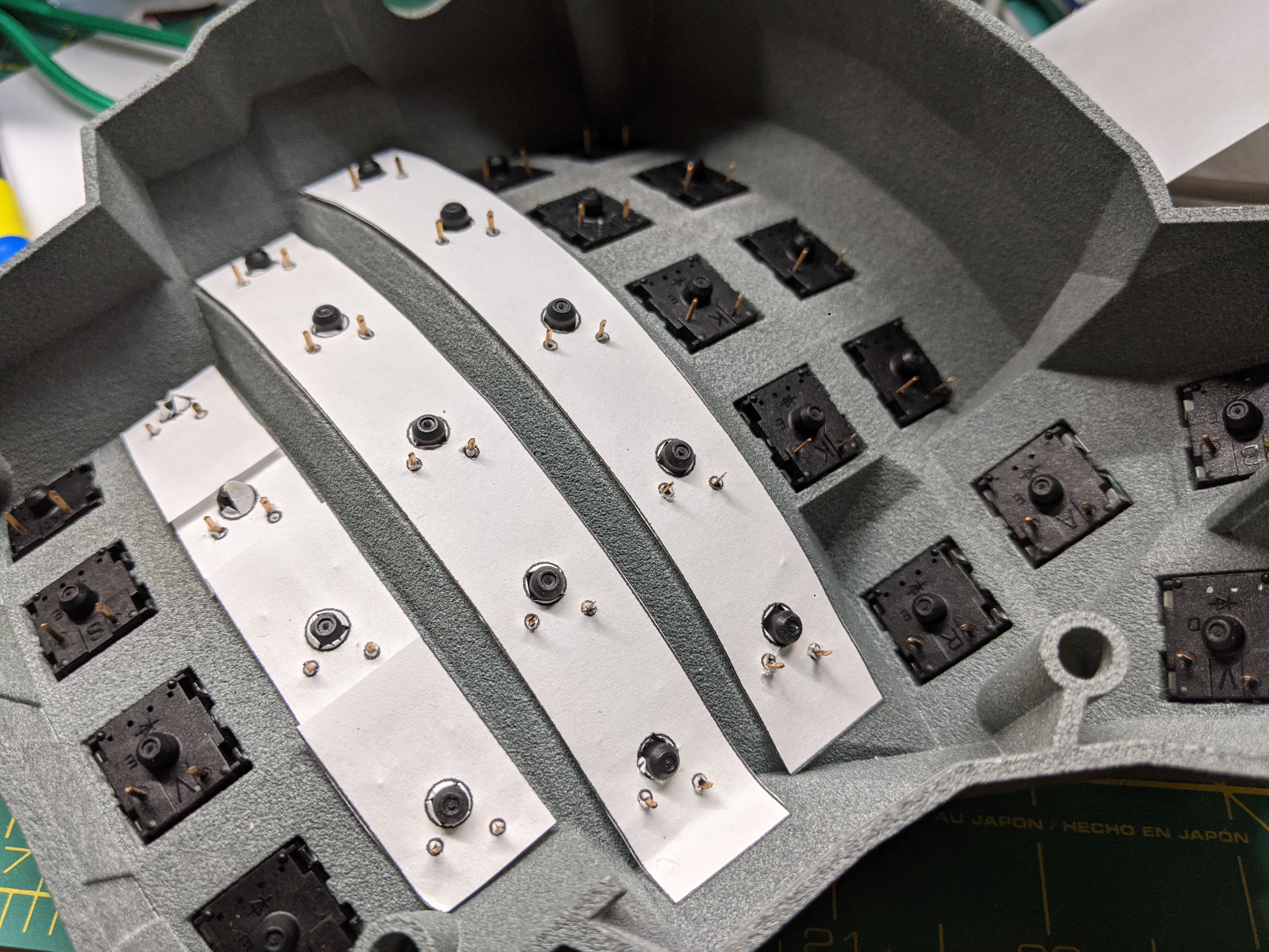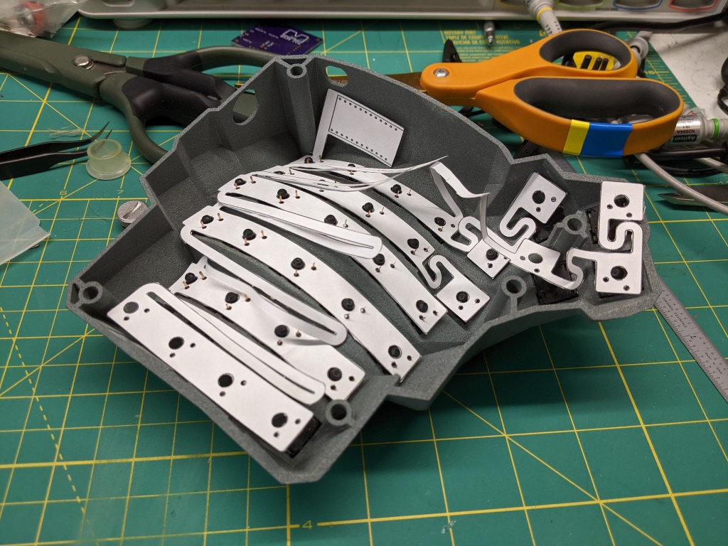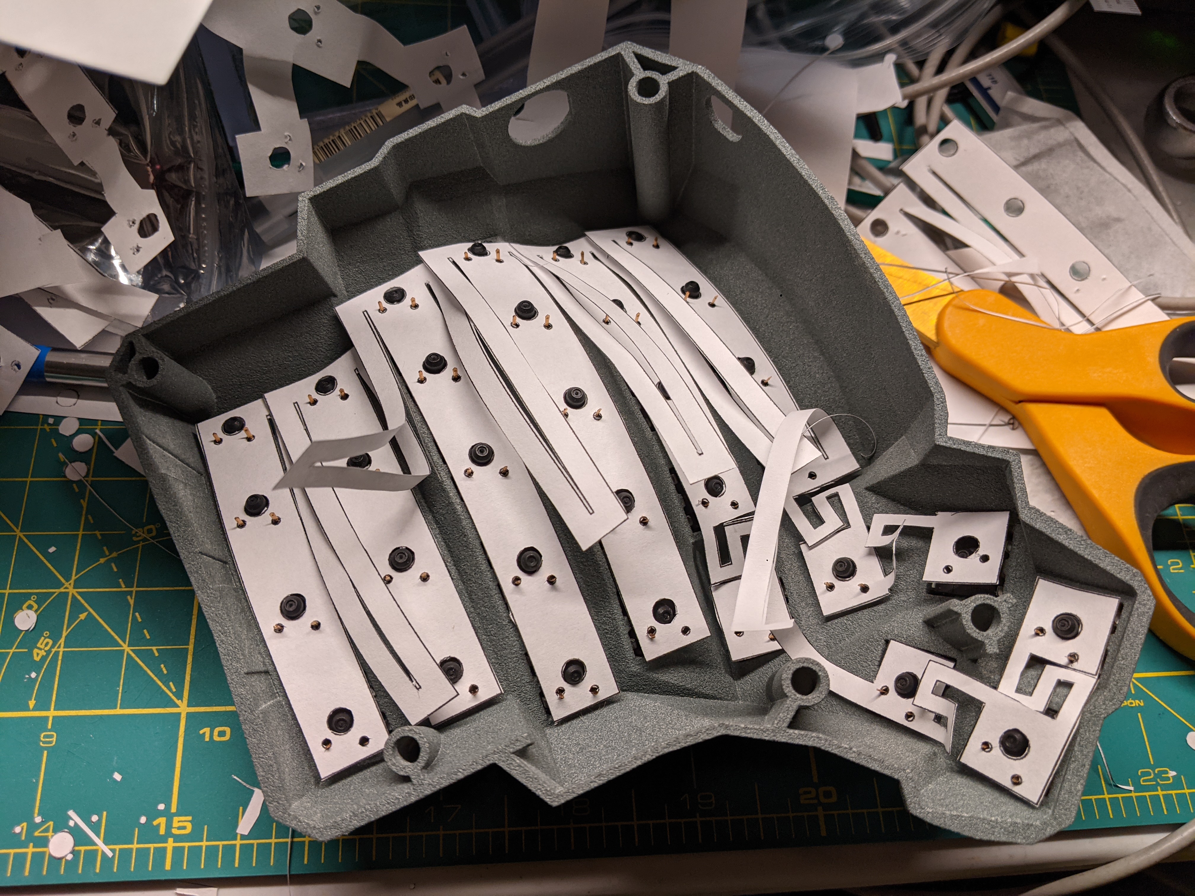 I went back and forth between physical prototypes, electrical layouts, and sketches to arrive at this final shape. Paper cutouts are a cheap and fast way to design, and making a physical model gives me a lot more confidence in terms of clearances (especially for assembly). Doing this in a CAD model would have been possible, but nightmareish, due to the curvature and odd angles of the switch connectors.