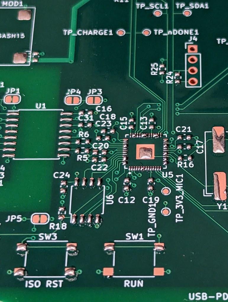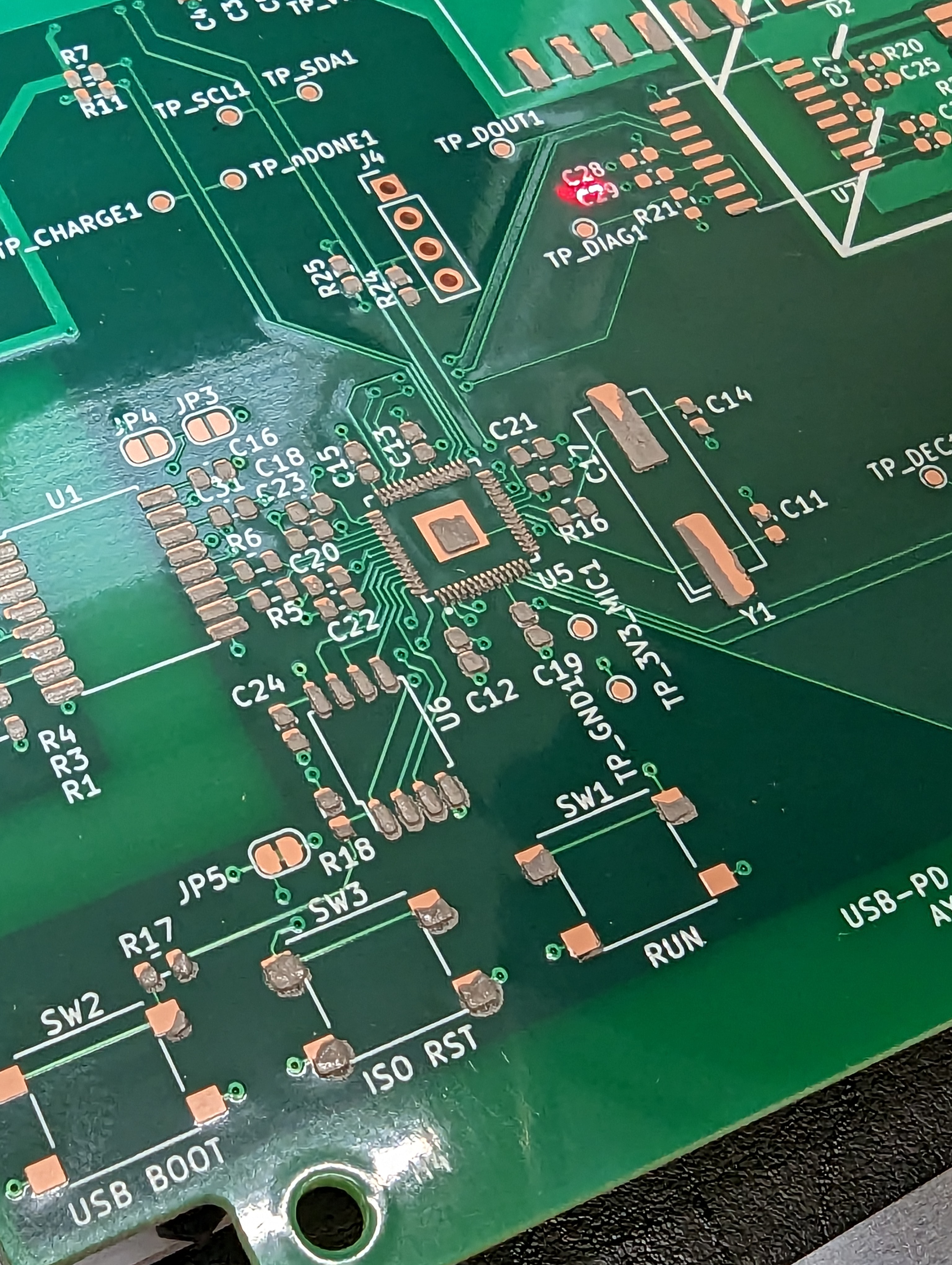 I wanted to really see what I could get away with, so I designed a board with a QFN, some fine pitch USB-C connectors, and a handful of of fine pitch leaded SMD components. There were also some larger parts like buttons, crystals, and a whole module, that represent “bulky” parts. To raise the stakes, I decided I would go crazy and use all kinds of $10 ICs.