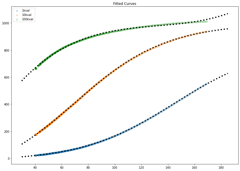 While it would be possible, through first principles and careful measurement, to figure out some mega-equation for all these components, I decided it would be a lot easier to write a script to calibrate each “channel” of the measurement. These thermistors are calibrated against a thermocouple, which was the original sensing element on the hotplate. To collect calibration data, I just measured the hotplate with the thermistor and thermocouple taped together. This produced the curves above, as expected from the simple simulation. Shown in black dots are fitted curves- the bottom two fit a sigmoid/logistic curve, and the top one (which didn’t have enough data to fit to a logistic curve easily) is fit to a 4th order polynomial. The 100k resistor values (green, top line) were pretty useless above 40C, quickly flattening out.