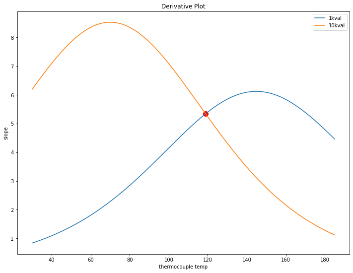 Looking at the two remaining 10k and 1k curves, the question is where to swap from one to the other. The goal is to keep the amount of ADC counts per degree C as high as possible over the whole range. This can be found by inspecting the derivatives of the fitted curves and finding where they meet (in this case, just around 120C).