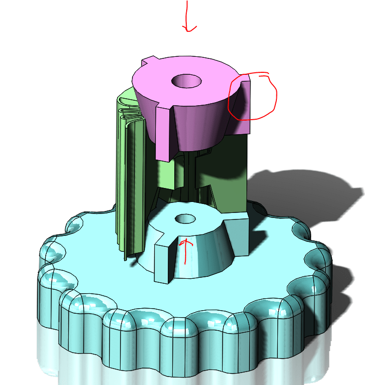 Another critical feature seen here are the fins on the cones that go into matching slots in the flexure. These prevent the nut from spinning freely, and it also allows transmission of torque from the handwheel to the arbor, once the wedges are locked in place rotationally.