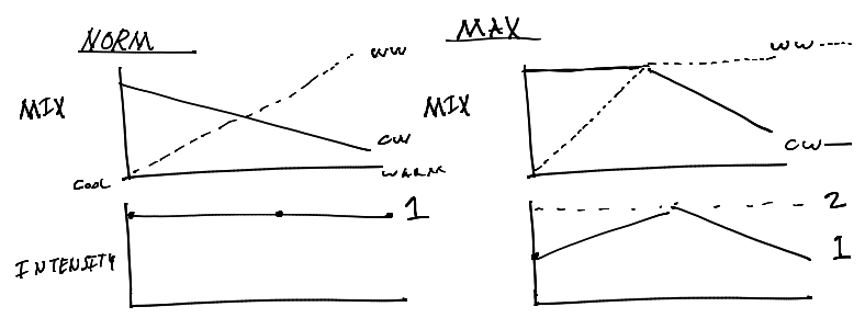 Max allows for the overall maximum light intensity to vary, but keeps the mix “smooth”. So at full warm, 100% intensity, the brightness of the warm strip is 100%, and at “balanced” temperature, 100% intensity, the output is 100% warm 100% cool.