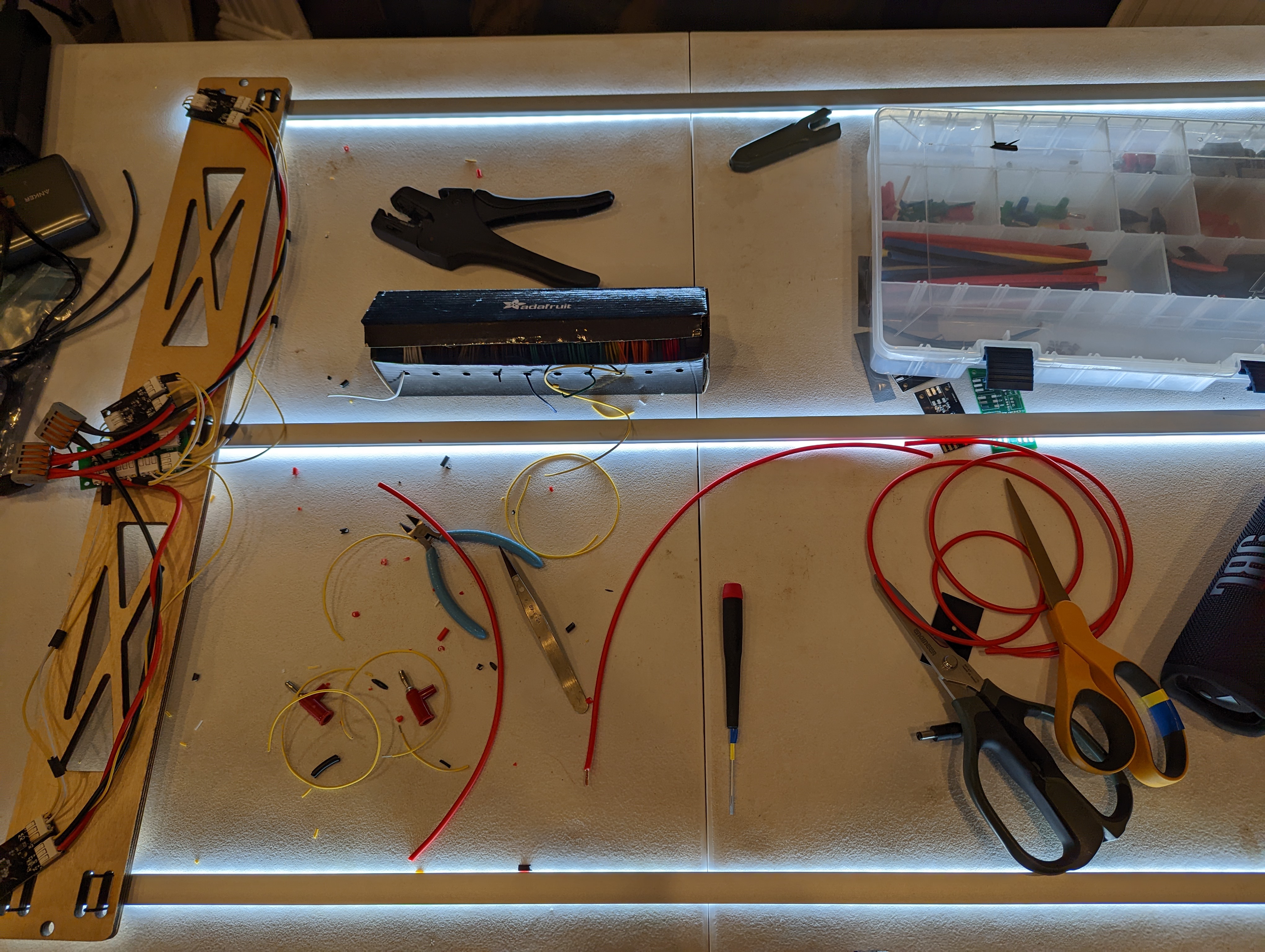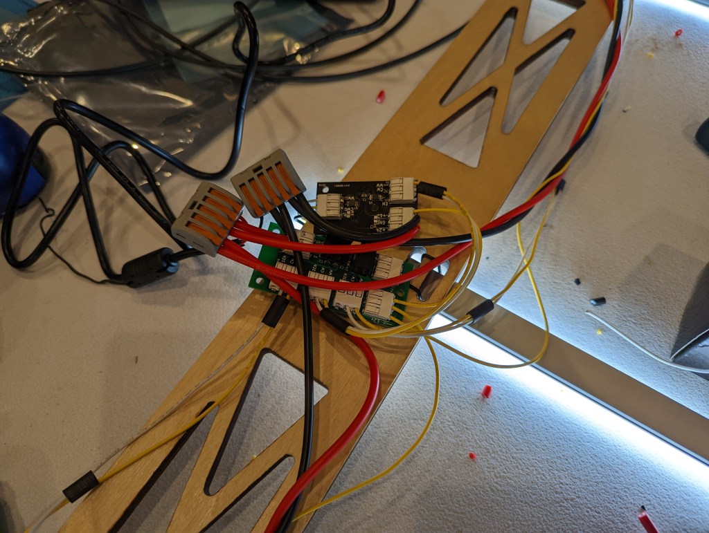 This wiring leaves a lot to be desired- this is because the boards and mechanical assembly were developed at different times, and the mechanical side of things ended up going to “plan b” aka laser cutting. It might be worth revisiting in the future, especially because a lot of ports/connectors ended up unused. For now, I am just happy to have a lamp.