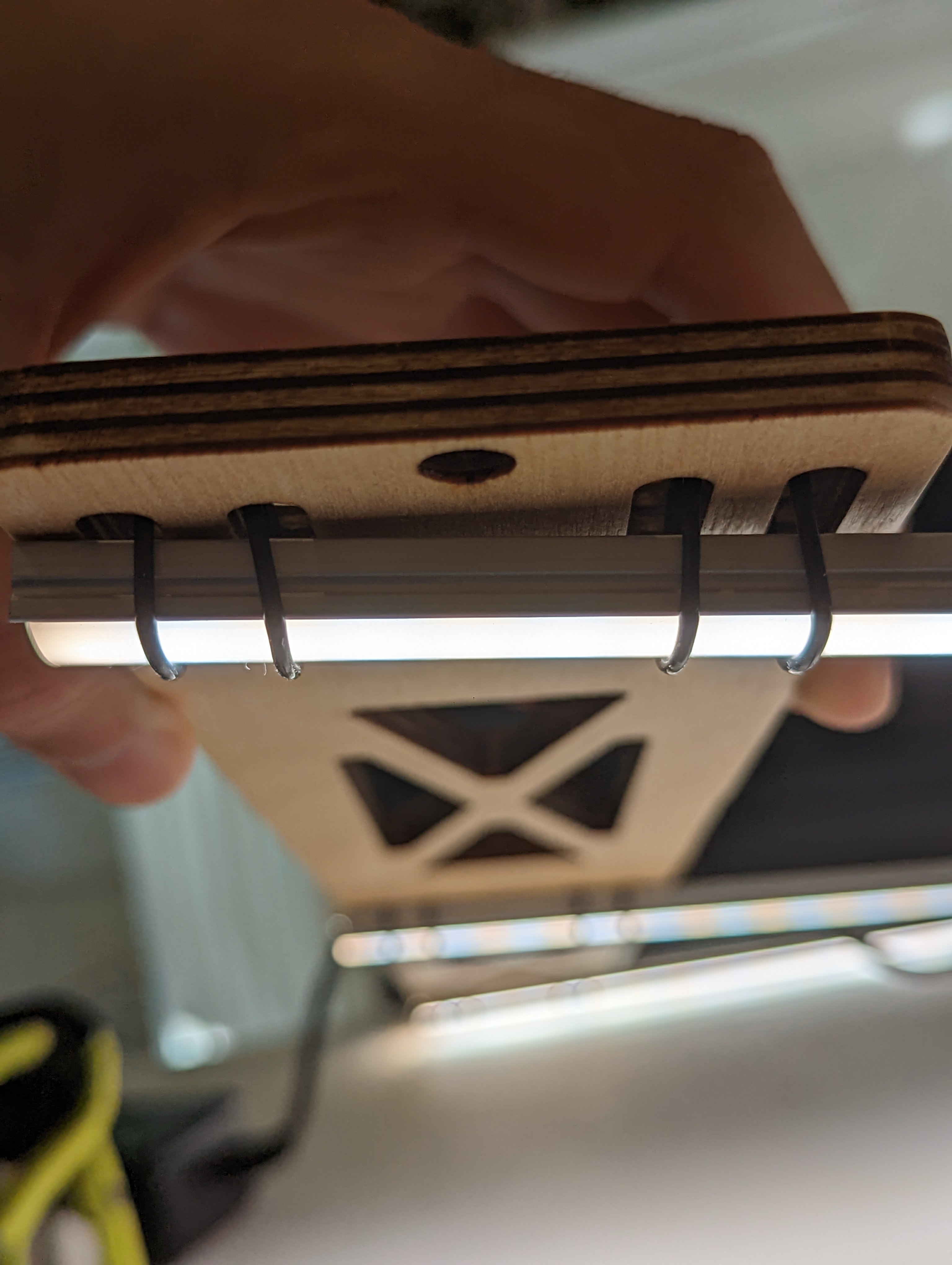 Instead of clips, I used the aforementioned fancy rubber bands, with two per side (four total) per LED channel. This means that if one breaks, I will have time to notice and replace it. Since they are flexible, the overall alignment of the strips matters less and the hole placement does not need to be spot on. They are also very thin, so they don’t block light.