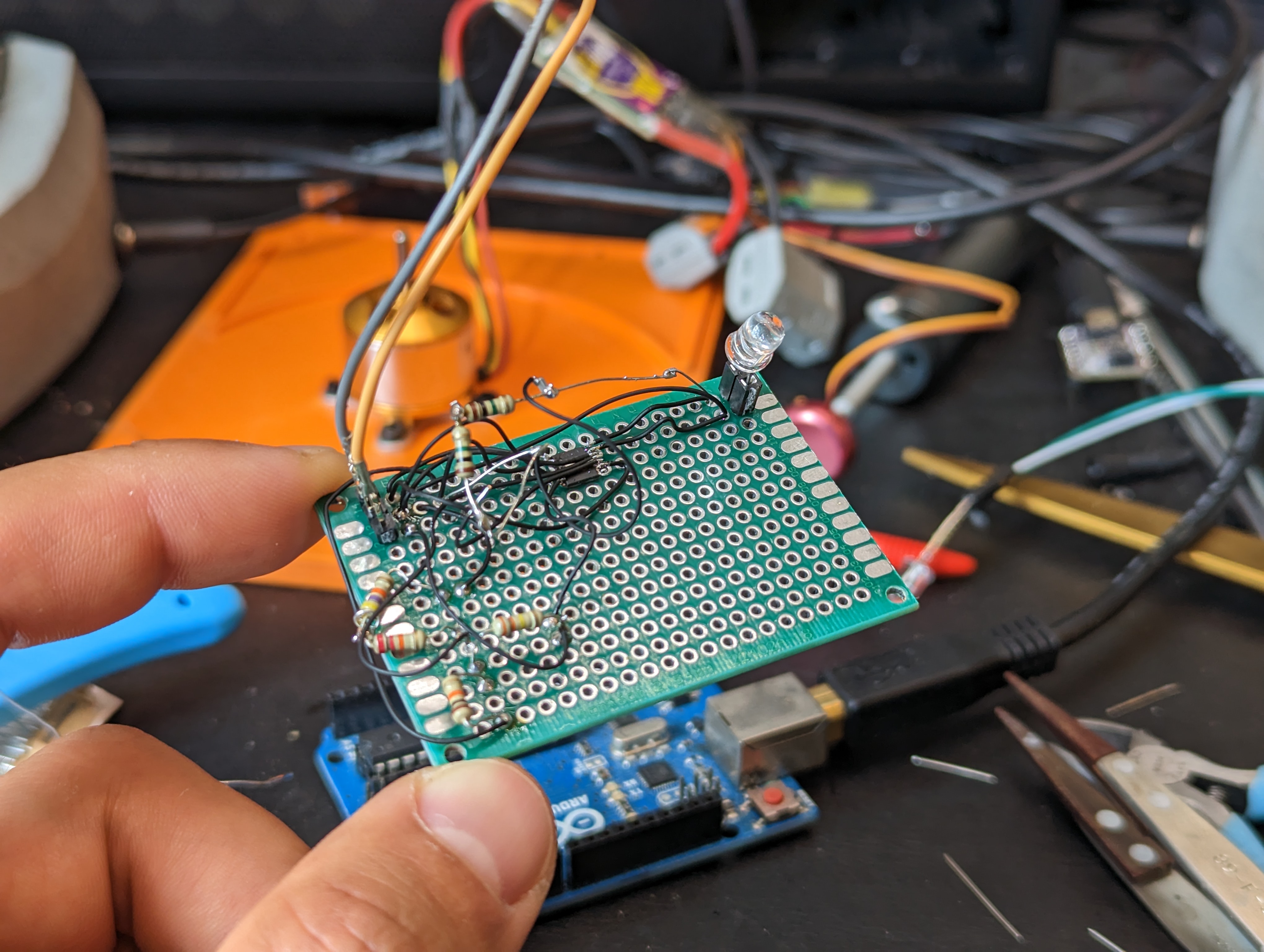 One component I don’t often use (aka have in the junk bins) are “fast” analog light sensors, like the kind you would use for a tachometer. However, I do have a lot of LEDs, and I managed to find one single op amp part in my junk bin, and so I figured I could either spend a day designing a pcb that would come in 2 weeks, or spend one day hacking together a tach.