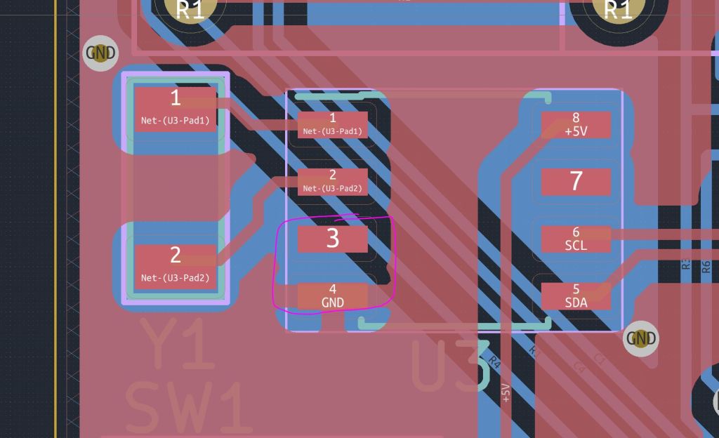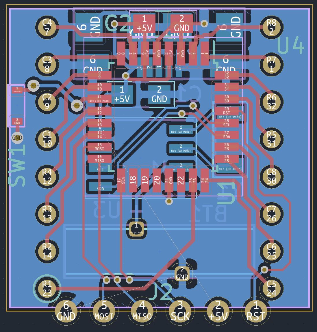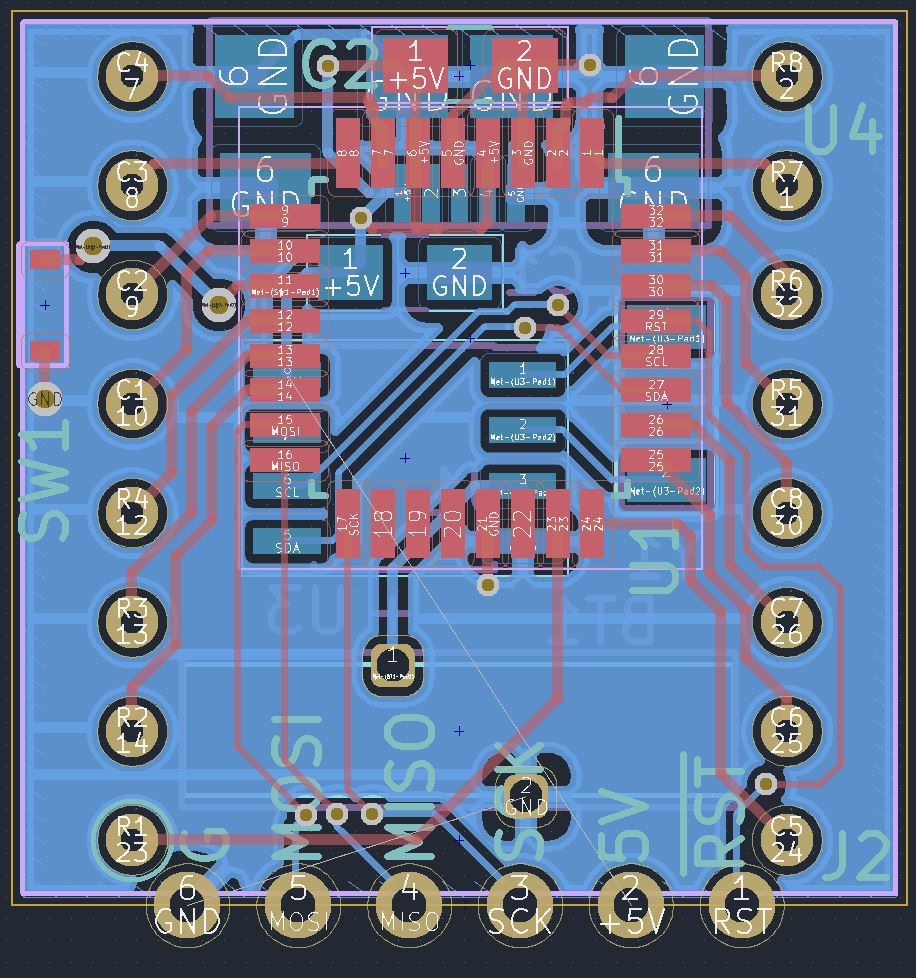 there wasn’t a lot of real estate on this board once the display was placed, since it is through hole. The pins basically cage in the rest of the components. In order to get a clean layout (no vias on any of the display pins), I did a lot of pin swapping. Based on having to tweak the code last time for a new matrix, I knew that I had total flexibility here.