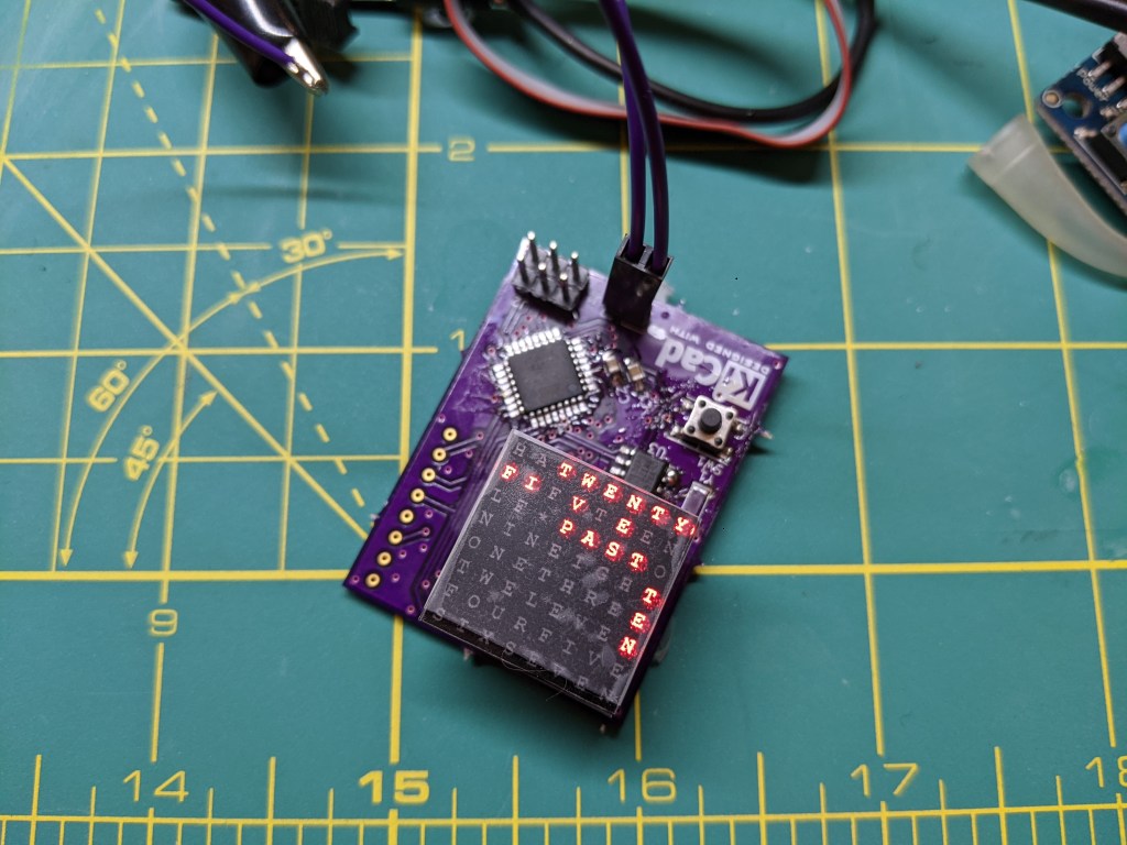 I am planning on teaching some people to use kicad, since its my new favorite EDA tool. I searched high and low for a decent circuit that would do something cool, with a good variety (but small number) of parts. Basically something fun and not intimidating. I got hooked on formatc1702’s micro word clock. It is an excellent use of the atmega8 series unusually high current drive outputs.