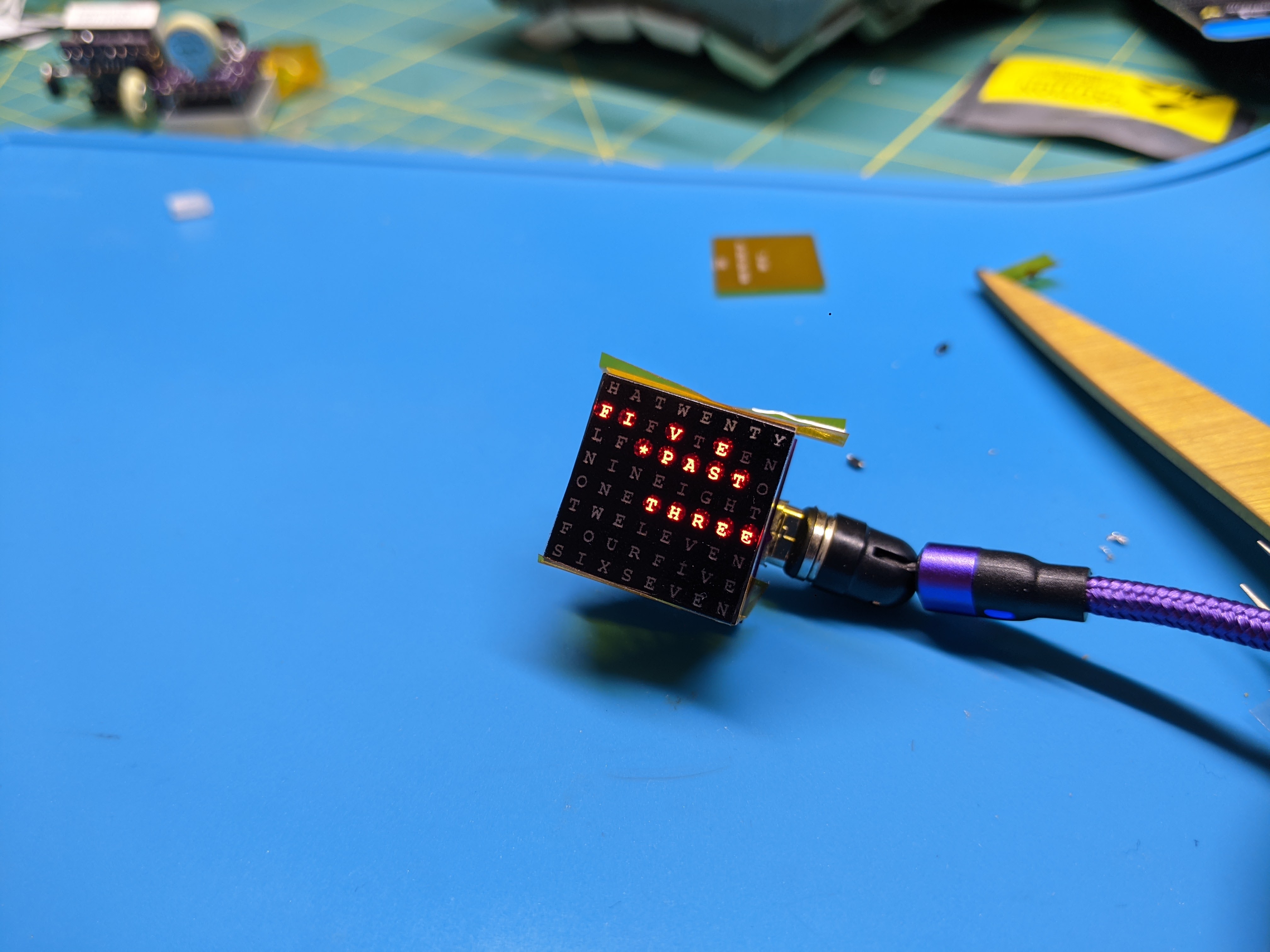 Just another version of the micro word clock. Like the old version, this uses a matrix that is more widely available than the original matrix, including on adafruit. Unlike the older version, this version is very tiny (no larger than the display) and it incorporates a battery fallback for the RTC, as well as a USB connector for power. This was a fun layout as I had to balance my hype for assembling teeny tiny parts (generally low) vs size.