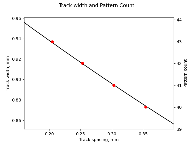 These first two expressions combine, after some work, into this ugly polynomial. we can now input an h, spacing between traces, and get out w. w allows for computation of N, the total number of units, which must be an integer to be valid. see plot below to compare red dots (N) to track width (mm) vs spacing, h (mm), as the spacing is increased.
