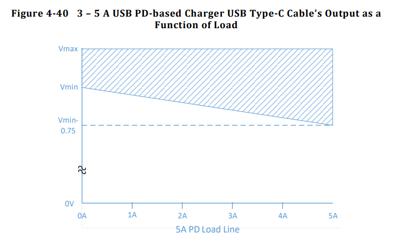 This Vmax and Vmin represent +/-5% of the allowable voltage. At 0A, there is no drop on the cable, but at 5A there is an allowable 750 mV drop. Interestingly, this drop is not symmetrical- only a 250 mV drop is allowed on the ground connection (even though it should have the same current flowing through it). This voltage drop at 5A means that a USB cable is allowed to burn about 3.75W.