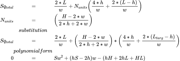 The ideal distance between the tracks, H, should be very small, because it will result in more coverage of the board in heater tracks, and therefore more even heating. I chose to start H at about 6 mil/.16mm. H needs to be varied so that the total number of units, N, is an integer. having a half-unit means that the spacing will be off or that it will not be possible to terminate the pattern properly. The next thing to do is to come up with a couple relationships for the geometry of the pattern. The first is that the pattern must be a certain number of squares long. This sum is the top and bottom width full length bars plus N units * squares per unit. The Number of units, N, also has to be equal to the target height of the units (Htarg – 2w) divided by the unit height. Here h is the spacing between units, and H is Htarget.