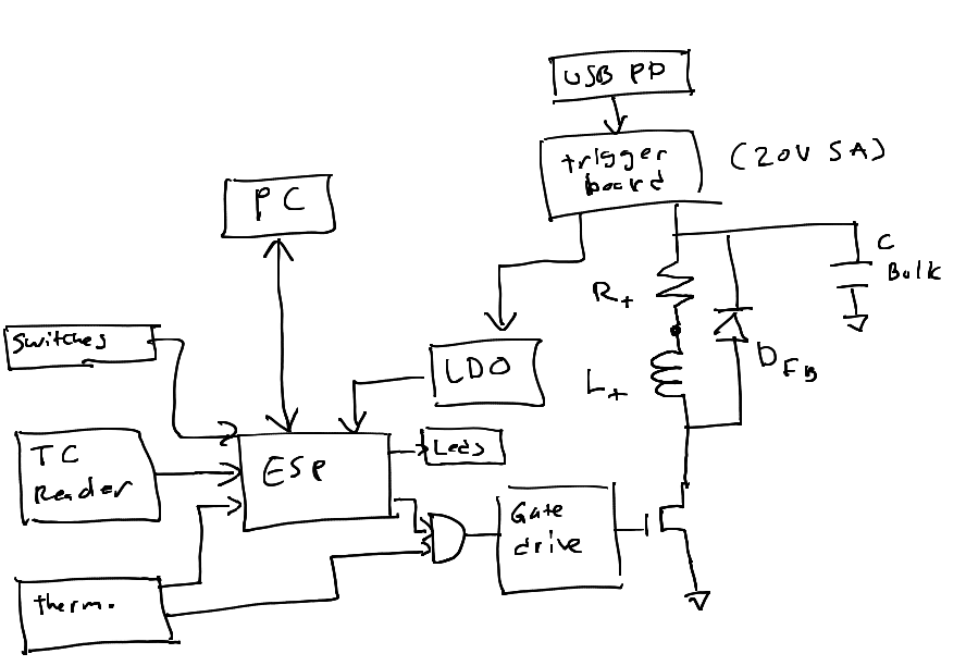 There are two usb C connections- one for programming the micro, and one for power, equipped with a USB PD “trigger” chip. My new favorite controller, the ESP32-C3 is in charge of the show (and native USB C). A single thermocouple is used for feedback, and an RTD is used as a safety cutoff- basically if it goes above some target temperature, the micro will no longer be able to drive the power FET. This won’t prevent the board from getting super hot, but it does provide a hardware safety against exceeding some set temperature if the controller spaces out…assuming the thermistor does not fall off.