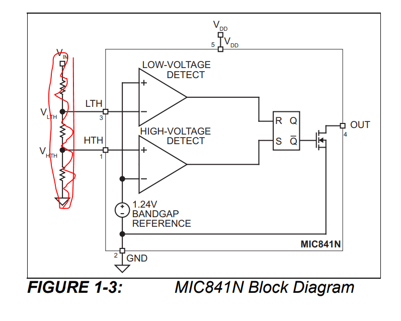 The first is a thermal trip based on the MIC841N The HTH input is fed by a NTC resistor divider that exceeds the 1.24V reference at about 200C. This SETs the latch, so the inverting output goes low, pulling down the enable pin of the fet driver. This is the case until either the whole circuit is reset (and the thermistor has cooled off) or until the reset line is pulled down by a button. Resetting while hot should result in an illegal state where ~Q is still 0.