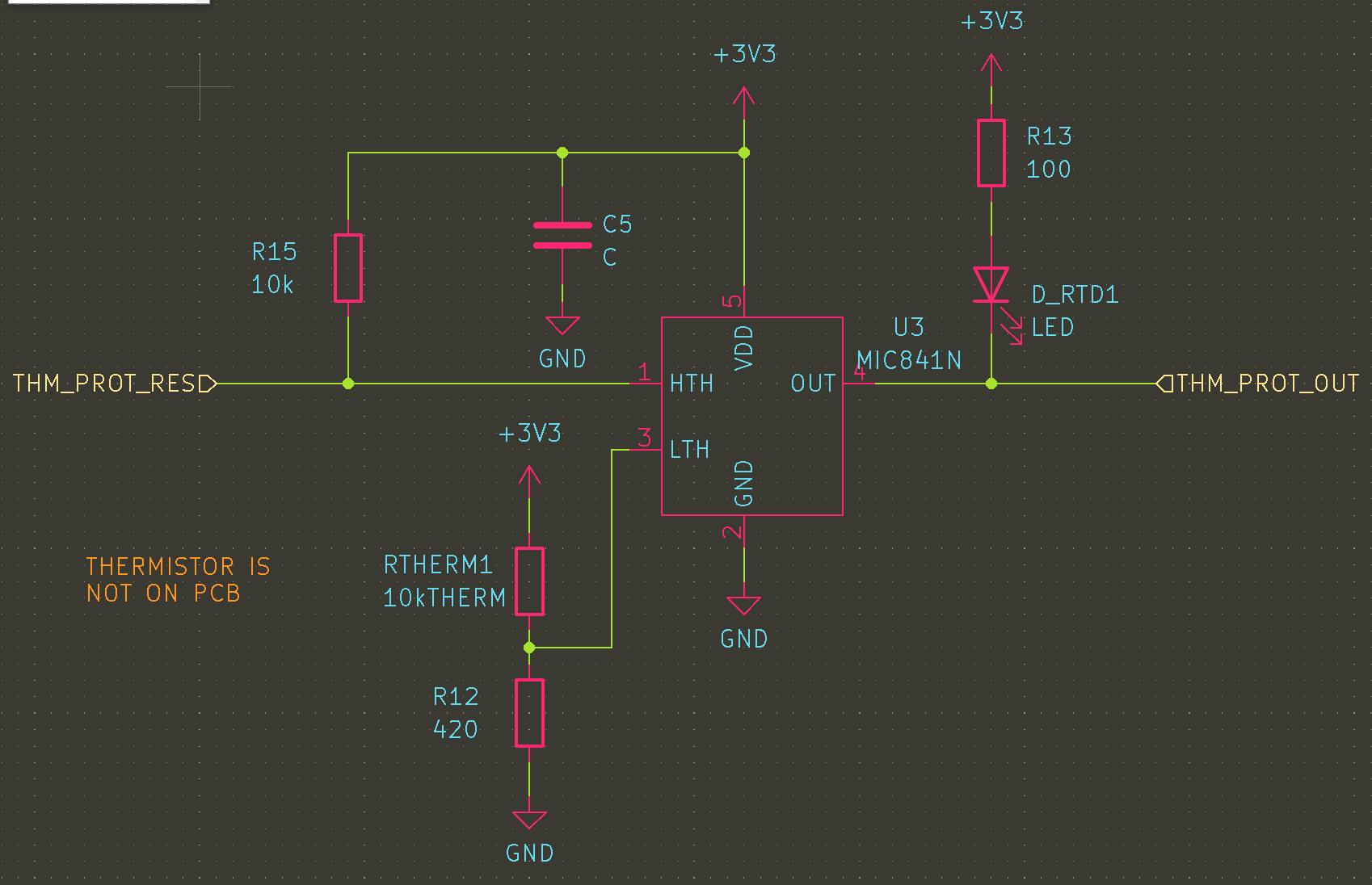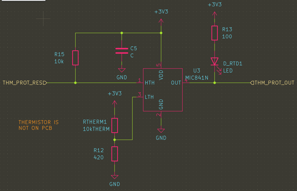 Note: this circuit totally fails if Rtherm is removed, and it wont work if Rtherm gets disconnected from “the hot part”. If I wanted to add more logic, this could be resolved, e.g. inverting the logic of the resistor bridge. However, this is currently just a secondary protection. If it works nicely it can be refined later.
