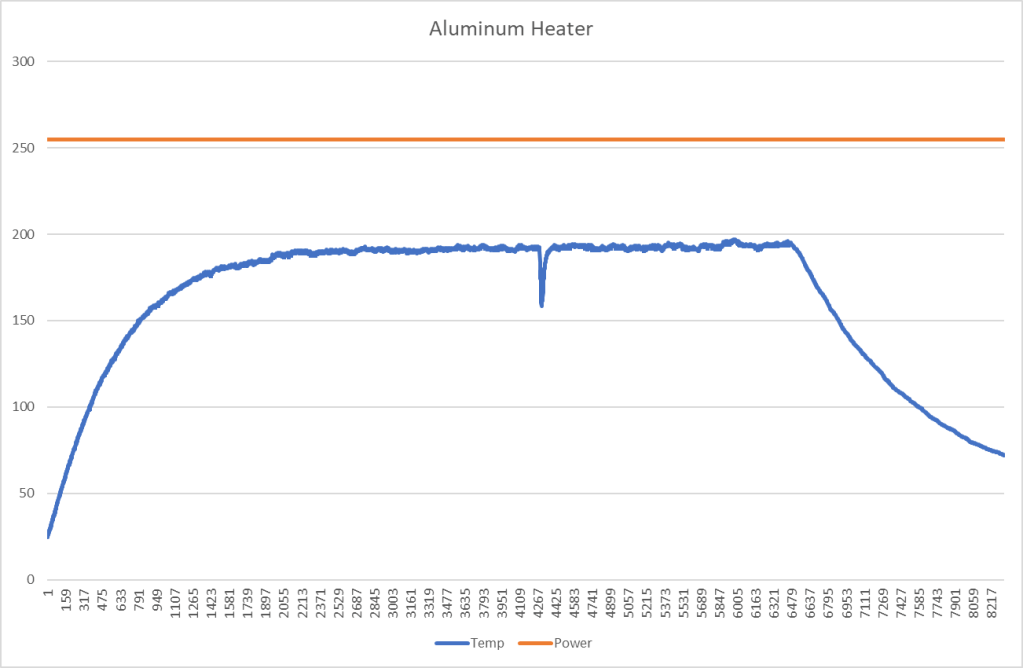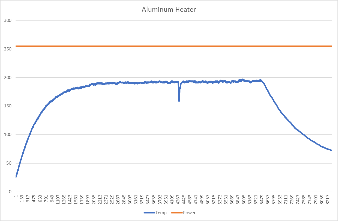 Unfortunately, this means that at higher temperatures, the power delivered to the aluminum board is much lower than desired. The calculated value for the resistance at 200C is about 6.7 ohms, and the measured value is 7-8 ohms. This means that the maximum power available at 20V is 50-60W, or less. This is pretty close to the theoretical minimum power needed to reach 200C, which is why this plate struggles to achieve 200C. As you can see, the heater is on for the entire time (until I pulled the plug). Time units are in 10ms intervals. Fortunately, this validates the power delivery assumptions I made in the past post.
