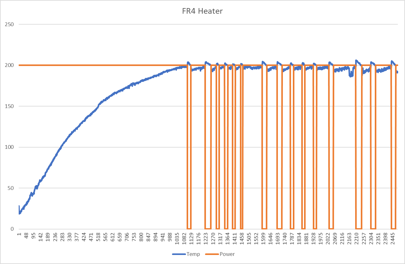 To get a truly performant hotplate, the resistance at 200C needs to be less than 4 ohms, so the full 100W (or close to it) can be used to maintain the target operating temperature. Doing this is tricky, because it means that at 25C the heater can’t be operated at 100% duty cycle. Basically, power is not a function of duty cycle, but of duty cycle, temperature, and board characteristics.