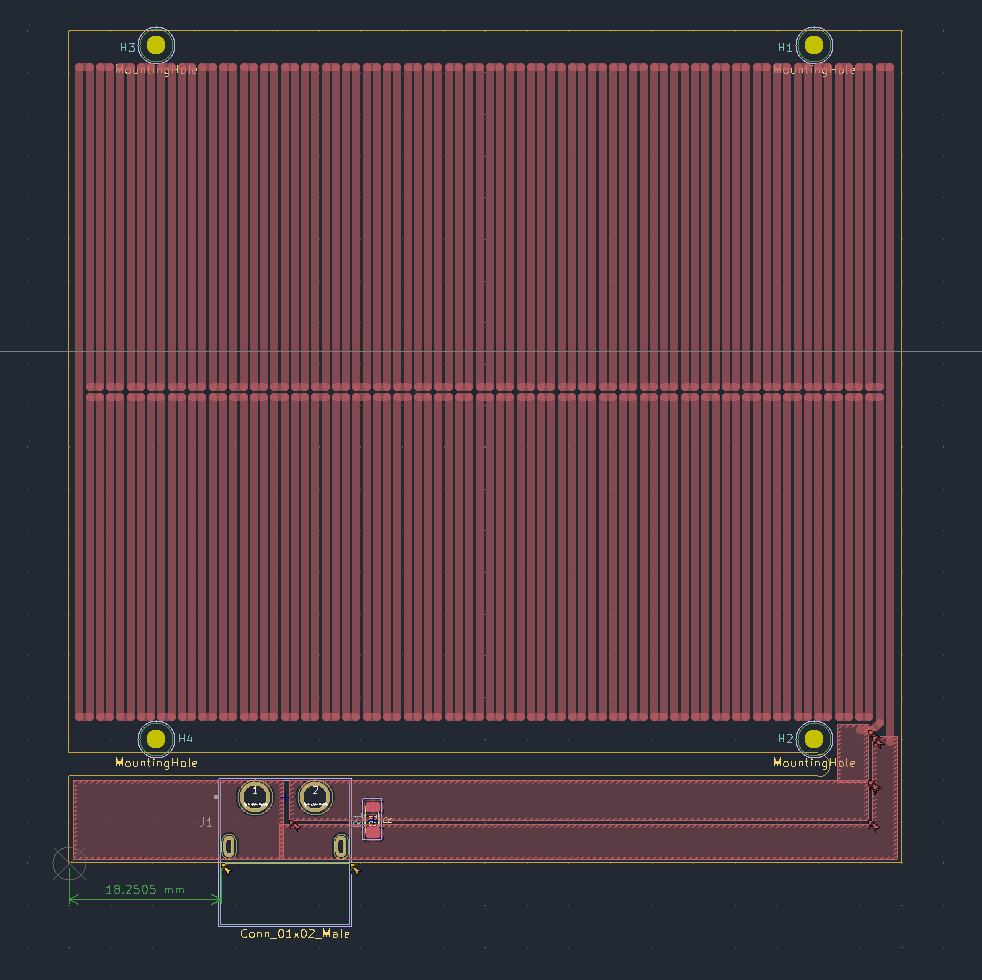 Since the pattern can’t go all the way to the edge, and because the mounting is somewhat TBD, I decided to subtract a 1mm border on the long (100mm) dimension and add 4mm border on the short dimension. This makes the final dimensions for the board 100×100 (including connector), and the pattern dimensions 98×78 mm.