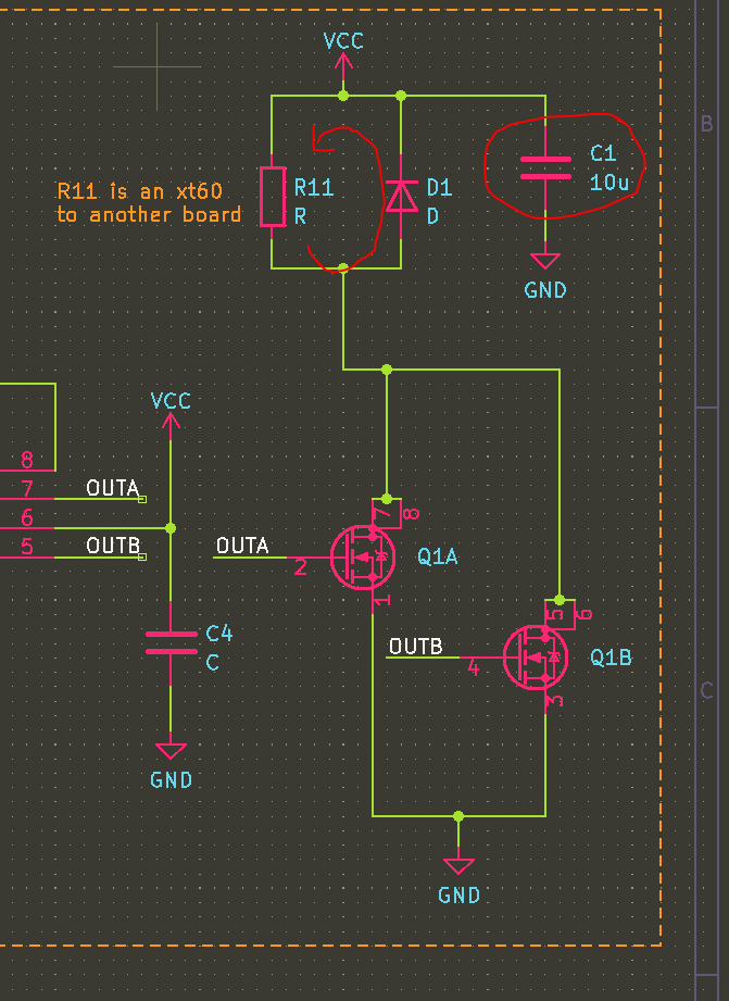 To make things worse, I didn’t add much copper to dissipate heat on the FET, and at least half the copper is on the side of the driver, which actually makes things worse (its easier to for the FET to heat the driver). Adding some vias to a large plane on the back, and increasing the area on the front will increase the area the heat can easily dissipate from.