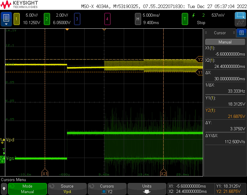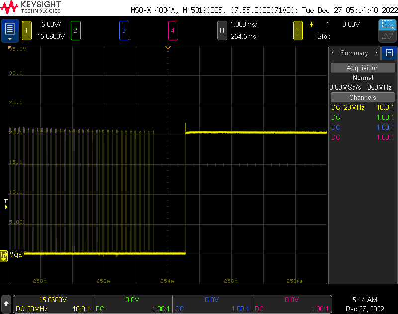 The Vgs, shown above, was totally fine since it was limited by the free-wheeling diode. Even with a 1ms charge time, the inductor failed to exceed 25V and there was very little ringing. The Vdsmax is about 30V, so there is plenty of margin.