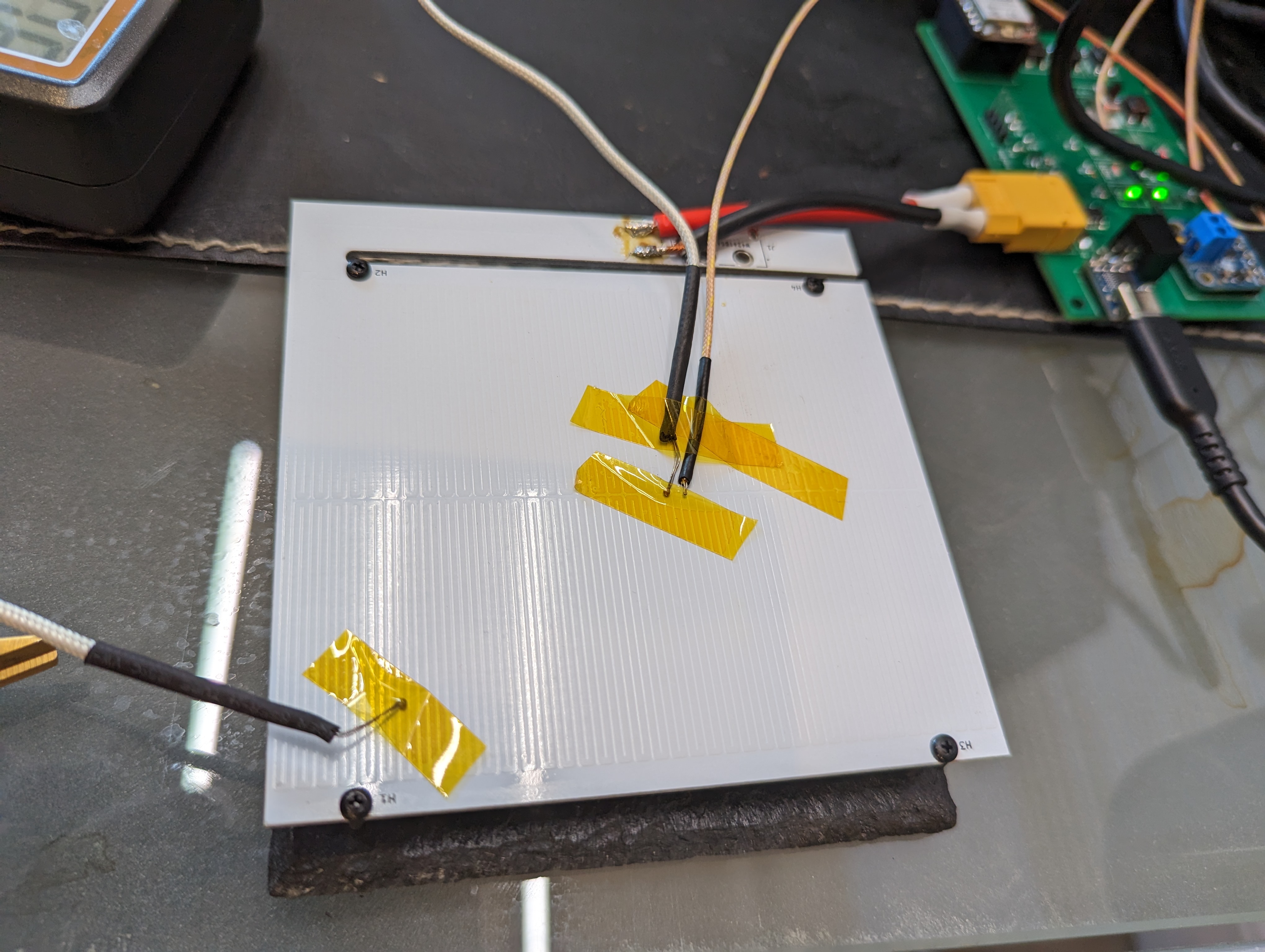 If we look at the existing hot plate examples, one figure of merit seems to be the steady state temperature at a given input voltage, and therefore power. My suspicion remains that connectors are eating a lot of power here, because the numbers do not add up. For example, at 3:10 in the hot plate V2 video we see the power supply is at 12V 7A, for a total input power of 84W. The temperature is 196C, with a room temp of about 25C. The heater diameter is .01 m2.