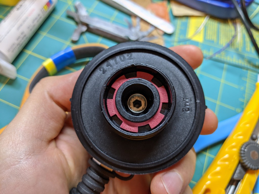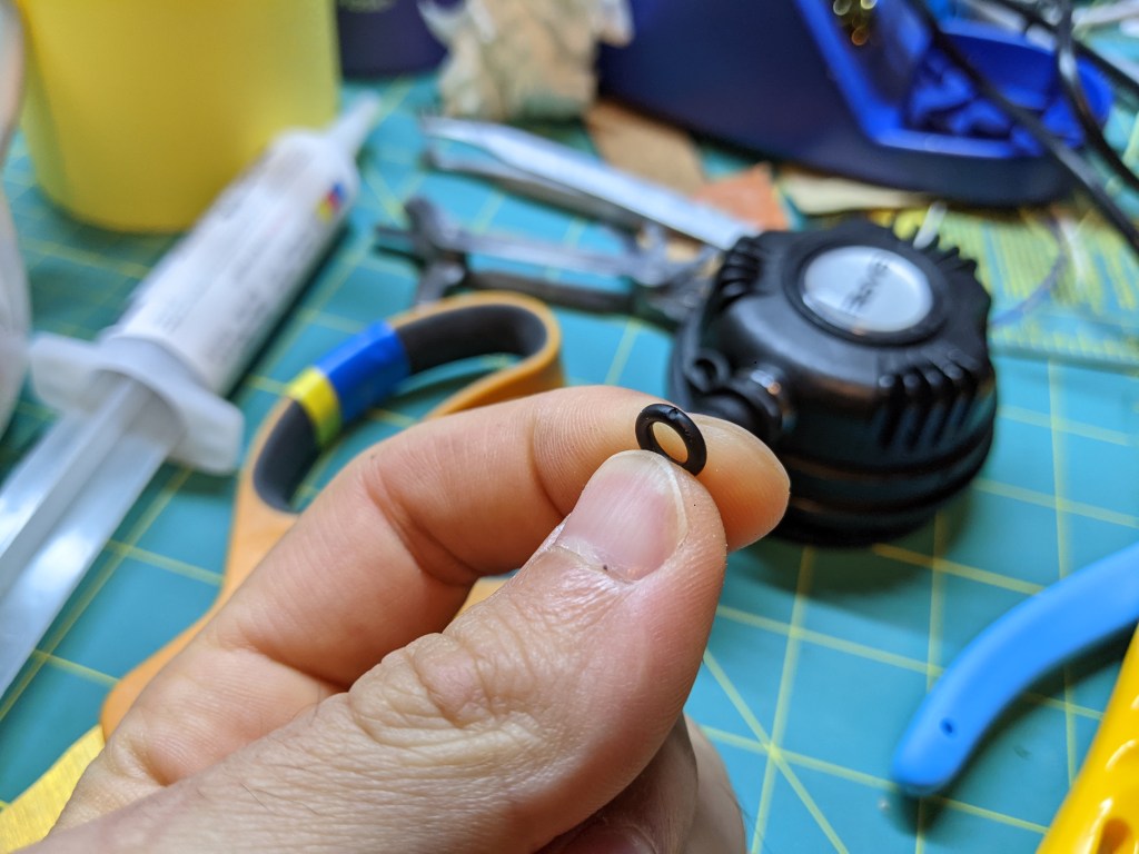 Next, the BARE sticker was peeled off and the button underneath was unscrewed with a 2mm and 4mm hex key. This allowed the valve barrel to be removed and the orings inspected. Interestingly, the bottom one was nicked-possibly the source of the leaking.