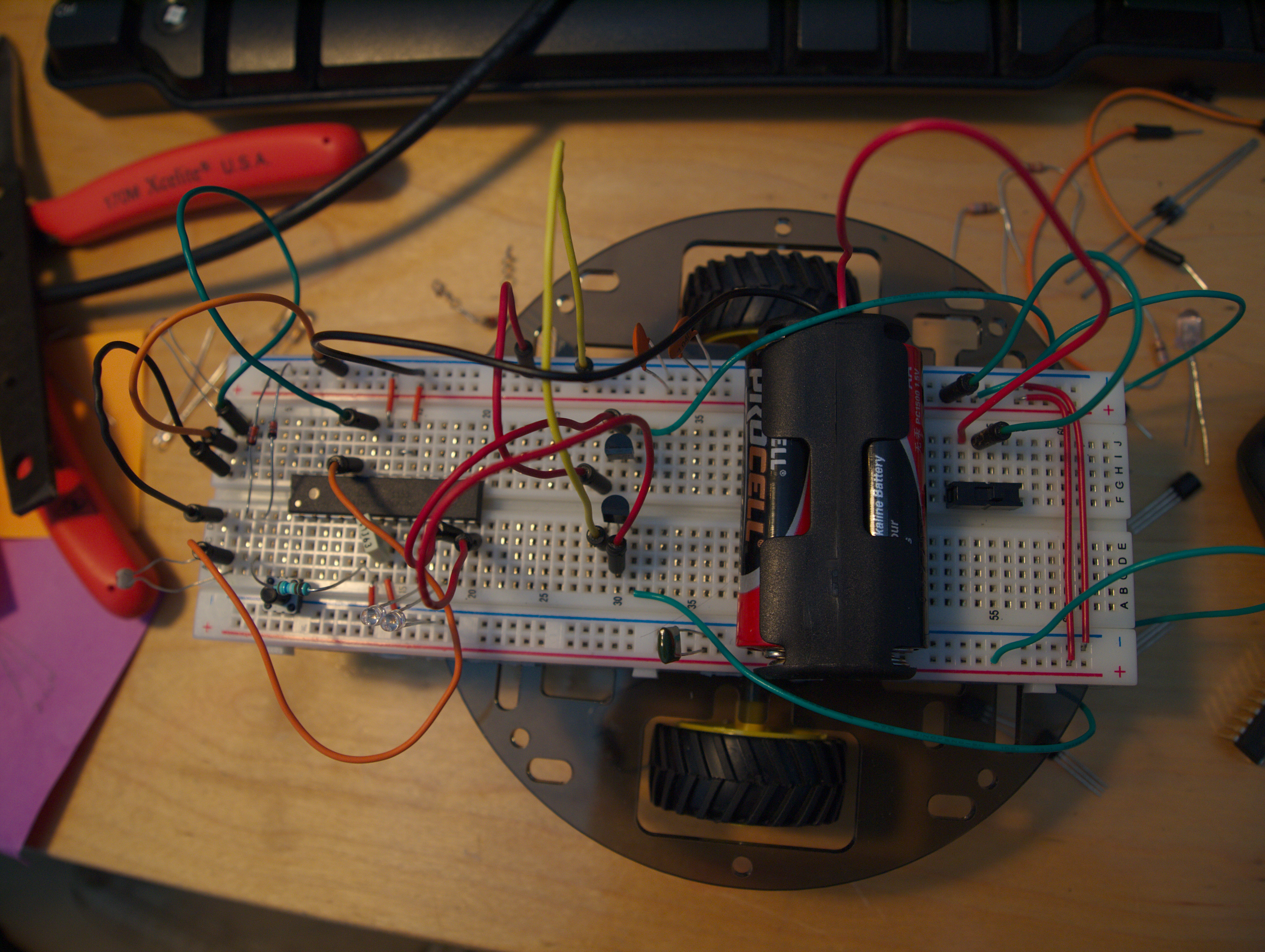 That said, the bots still work at 5 volts, albeit with a drastically shorter motor life. But operating at 5V this seemed to cause too much of a current drain on the power supply, so we got some weird twitchy behavior during the class. Since then I have developed a cheap fix using two 2n3906 NPN transistors, and a smattering of decoupling caps.
