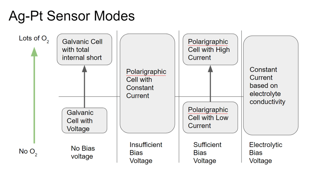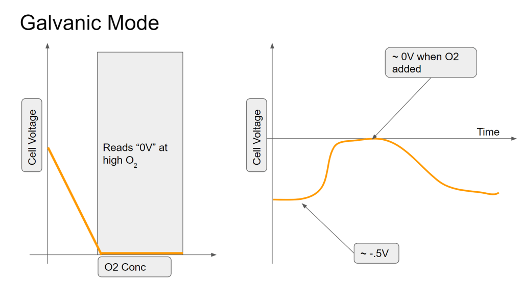 In this mode, the sensor is producing a voltage instead of a current. As most people know from things like potato clocks and glavanic corrosion, two dissimilar metals in an electrolyte will tend to produce a voltage (across the metals). Based on my measurements and not my knowledge of chemistry, it seems like it is still the case with this cell- a small voltage (500mV) is produced between the Pt and Ag in the electrolyte. However, when exposed to oxygen, it seems like that voltage is reduced, probably by discharging the accumulated charge (voltage) back through the electrolyte. This can be considered an internal short across the electrodes of the electrical cell. However, measuring oxygen based on the blocking of this charge accumulation (voltage) does not make for a good sensor and since the voltage source is very weak, has a long recovery time (minutes/seconds). It also reads 0V (saturates) below an amount of oxygen that is useful to measure. In other words, the readings get clipped below the O2 fractions that would be useful.