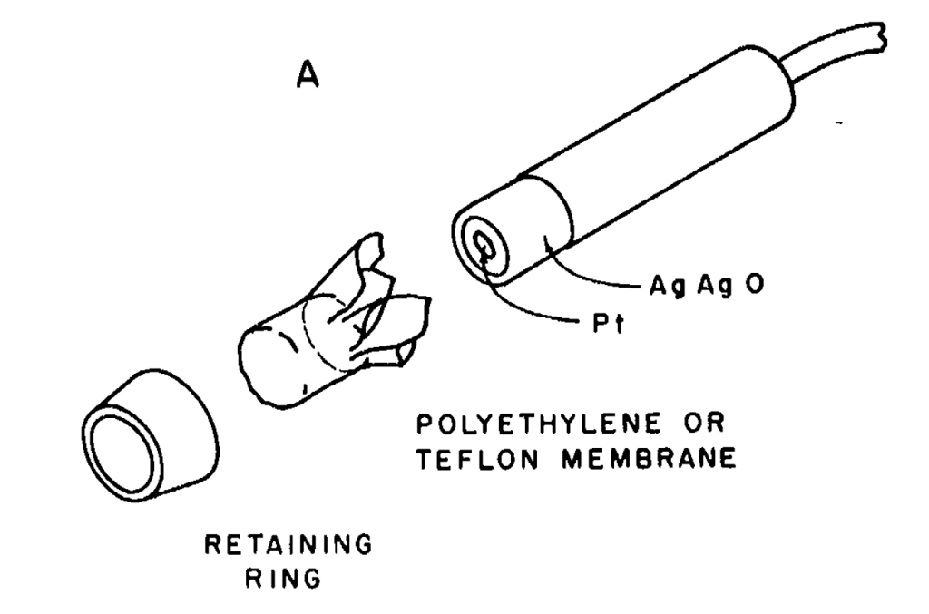 Mechanically, as you can see, the electrode is pretty simple. A Platinum disk with a silver-silver oxide electrode is covered by teflon, after trapping some KOH electrolyte underneath it. Less simple is the reaction. As I understand it, at the platinum electrode, dissolved O2, water, and electrons from the bias voltage to form hydroxides. At the silver anode, silver and hydroxides form silver oxides and electrons. One difference between the original clarke electrode and modern electrodes is that modern cell use KCl. Both certainly work, although KCl makes AgCl instead of Ag2O. I believe the reason for this switch is that KOH solutions are very chemically active and will turn people into soap, while KCl is a lot less active. Oddly both are food additives, although KCl has an LD50 of about 10x that of KOH.