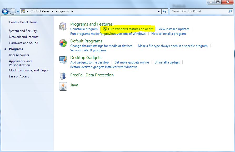 The first thing you should do is install Internet Information Services (IIS) on your computer. This is REALLY EASY, don’t be deterred by this step. Go to the start menu, open up the control panel, click programs, then got to the “turn windows features on or off” under programs and features. There should be a little shield next to it.