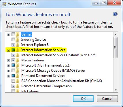 Since we are in windows, this will open yet another window with some kind of terrible check box/tree menu. You want to click the Internet Information Services button, then click OK.