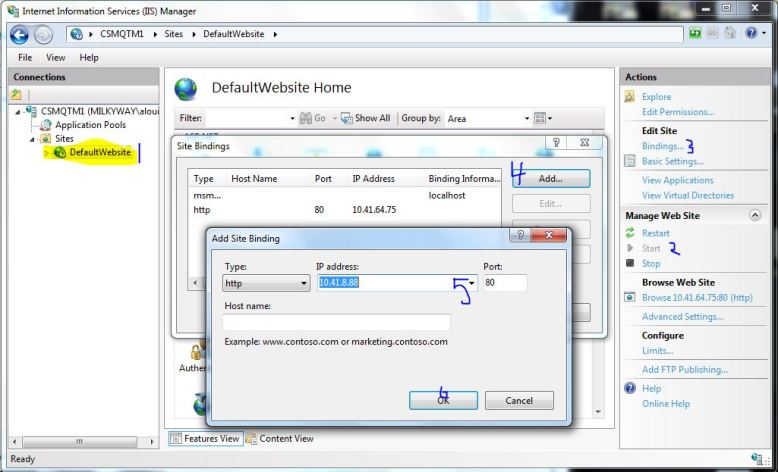 Now, the first thing you want to do is use the leftmost drop down pane to to navigate to DefaultWebsite. Then press start (right pane), if it is not already started. Then mouse up a bit and click on bindings. Click Add in the dialog that pops up. Yet another dialog will pop up. Use the dropdown menu for IP address and choose whatever IP happens to be there. Then click OK.