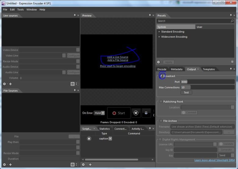 This should get IIS installed. In the mean time get a (legit, from MS) copy MS expression for free from here. MS Expression allows you to encode video as a wmv stream. Install it, open it, and click start broadcast project, and you should see something like this:
