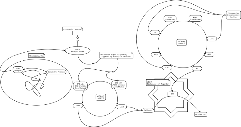 BLYES: hER-α receptor is encoded by chromosomal DNA. Activation of the receptor turns on production of luxA and luxB under the control of bidirectional EREs. This enzyme reacts with the FRP produced by the constitutively on pUTK404 plasmid. pUTK404 also encodes LuxCDE, which allows the recycling of FRP. frp, and Lux genes CDE have IRES (internal ribosome entry sites) in-between them to ensure proper transcription